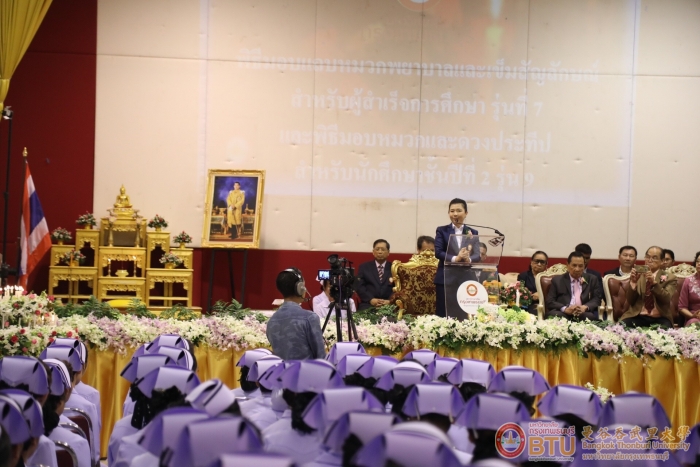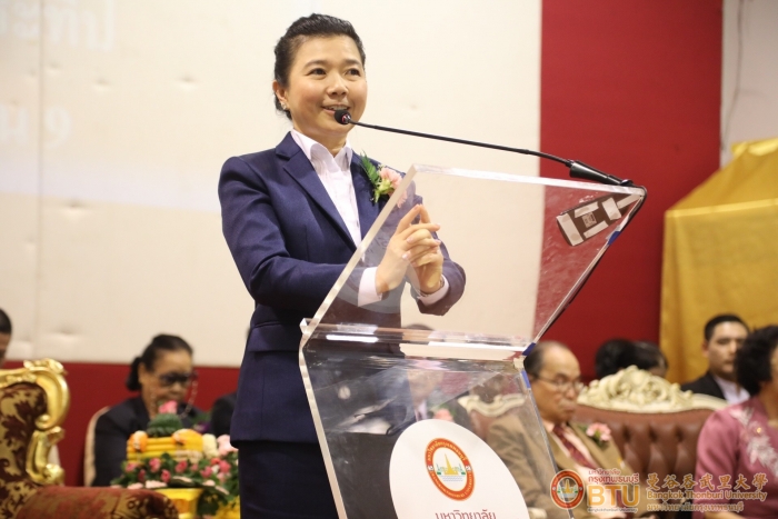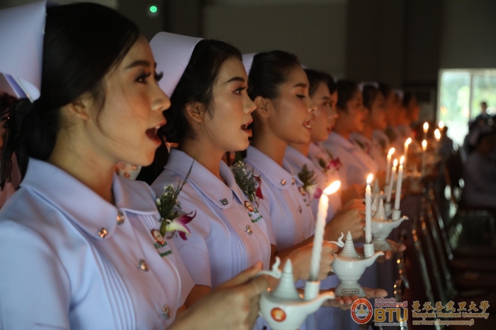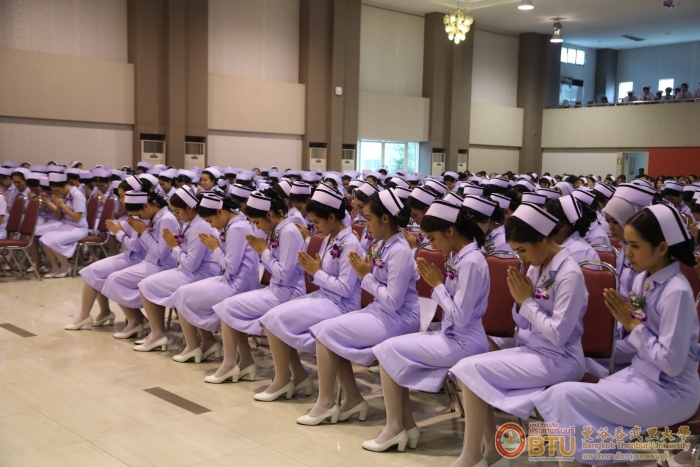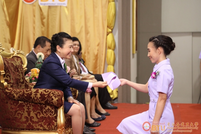 2018年3月8日,曼谷吞武里大学邦雯校长等校领导,在BTU大礼堂,为2017届护理学院118名护士毕业生以及在读二年级133名护士生举办捐赠护理帽和徽针仪式并颁发奖学金。