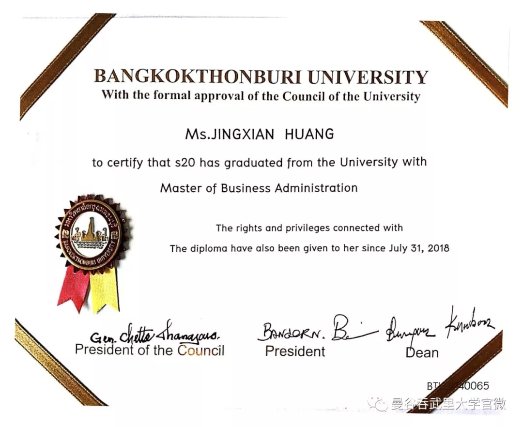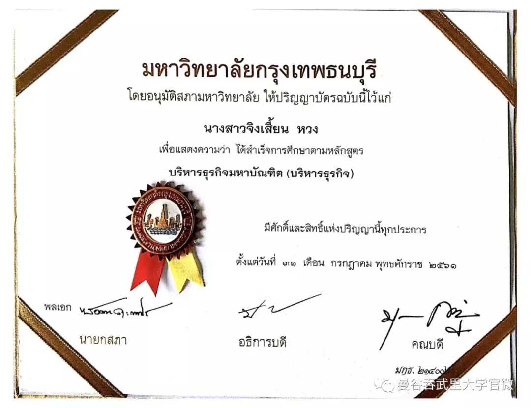曼谷吞武里大学本届授予本科,硕士,博士近3000名毕业生荣誉证书。其中授予了三位在专业领域上有突出贡献的学者“荣誉博士学位”荣誉证书。