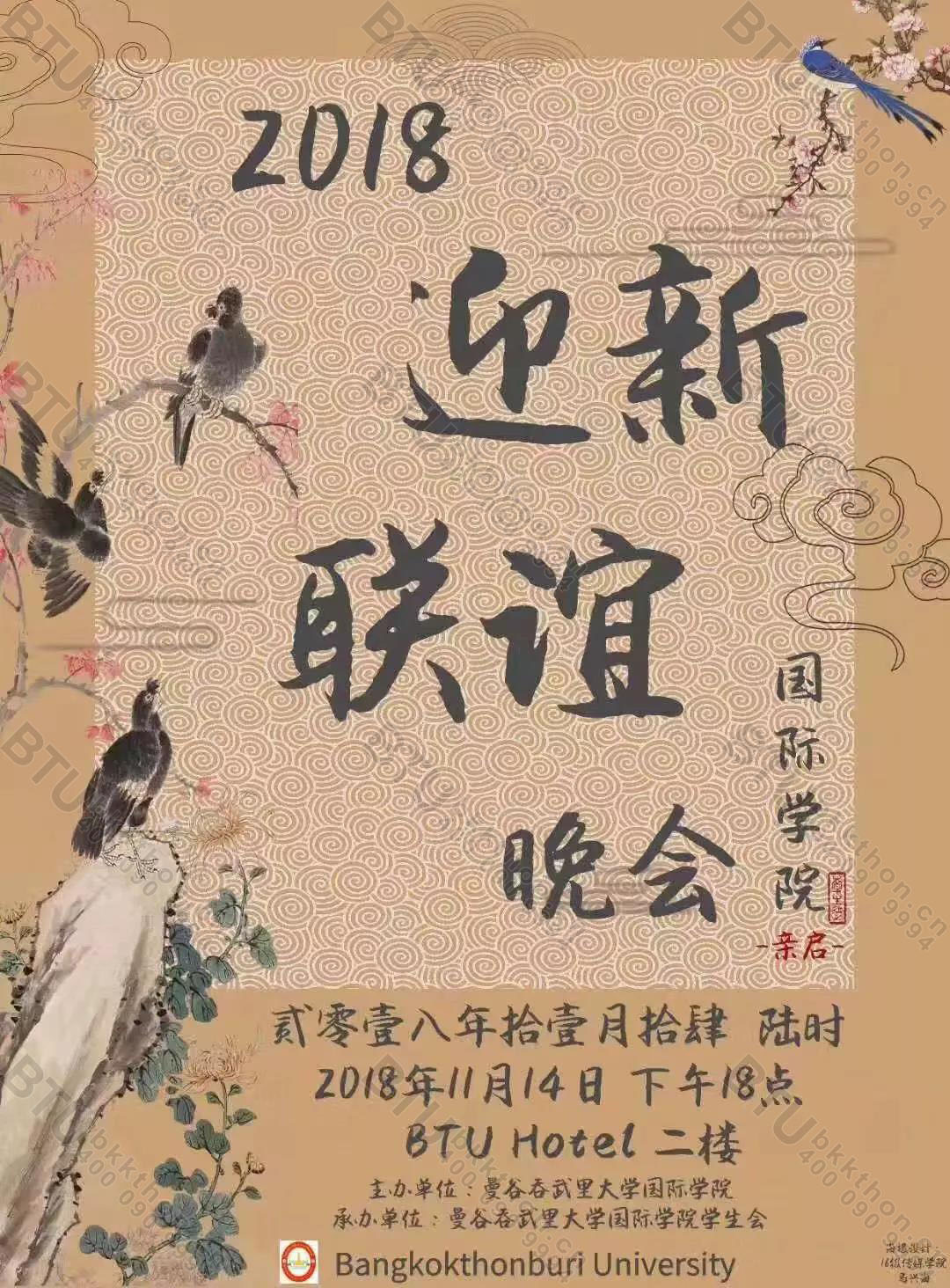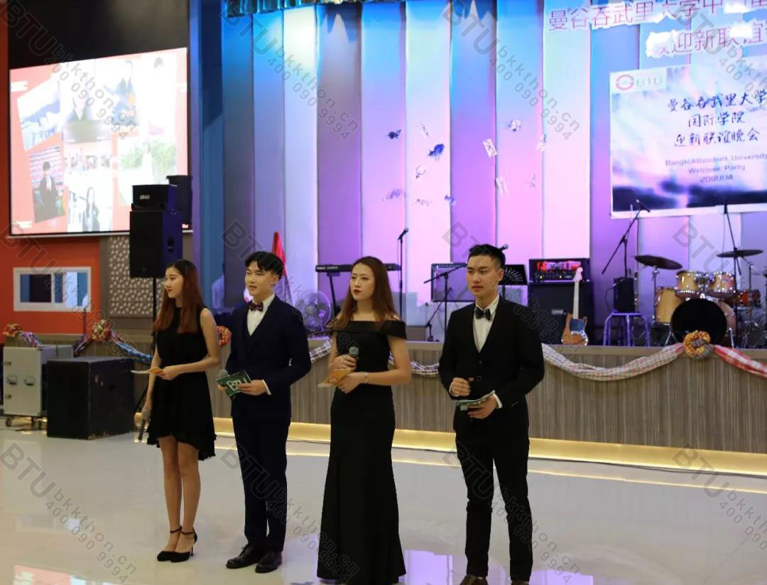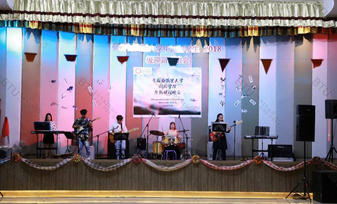11月14日晚,由国际学院主办,中国学生会承办的2018年曼谷吞武里大学迎新晚会在学校礼堂隆重举行。邦云校长、隆力副校长、拍是院长、林栩助理校长、叶敏主任、各学院院长,老师及新生辅导员出席大会并与中国留学生共赏晚会。