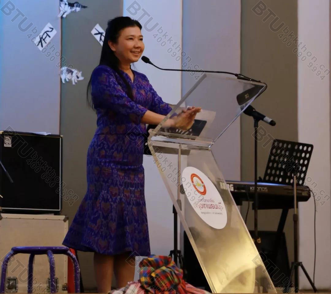 邦云校长代表学校热情欢迎新生的到来。她表示,学生来到大学,就进入了曼谷吞武里大学的大家庭,校领导与老师们会象对待自己孩子一样关爱每一位学生,学校所有课程都经过泰国教育部批准,希望同学们能认真学习,圆满毕业。