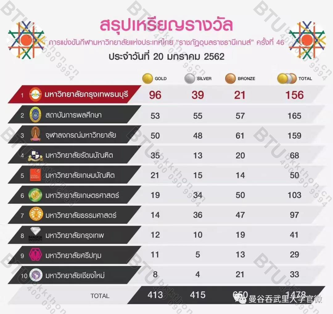第46届泰国大学生运动会于今日圆满结束!曼谷吞武里大学再次夺金牌榜总冠军并以96块金牌数打破了历史金牌记录!
