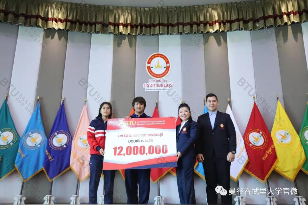 为了表彰在本次运动会上同学们的优异表现,邦云校长在学校宴会厅举行了庆功大会。会上校长对同学们表示祝贺,赞扬他们在运动会上积极向上、努力拼搏,展现了曼谷吞武里大学生的风采,并向所有得奖运动员颁发了12000000泰铢奖金,以资鼓励!鼓励大家将日后的学习工作做继续做好,在明年的运动会上再接再厉、再创佳绩!为曼谷吞武里大学争取更大荣誉!