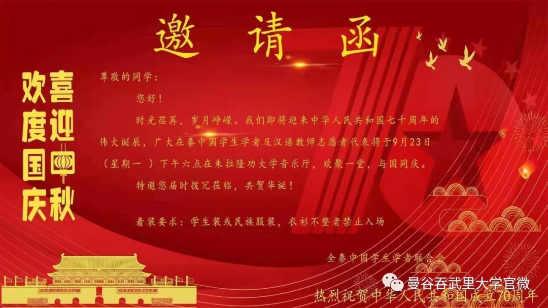 伴随着《我爱你,中国》清越激昂的歌声,全泰中国学生学者联合会庆祝新中国成立70周年联欢会在朱拉隆功大学音乐厅拉开了序幕。