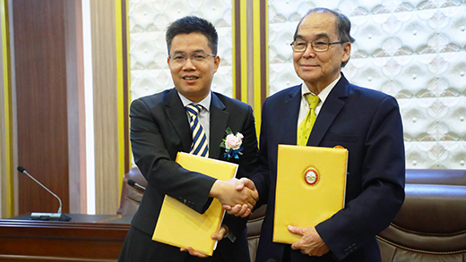 党校办主任张育方(左)代表我校与曼谷吞武里大学副校长Chaiyong Phromwong(右)共同签署合作谅解备忘录
