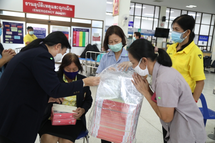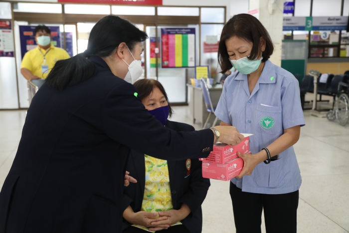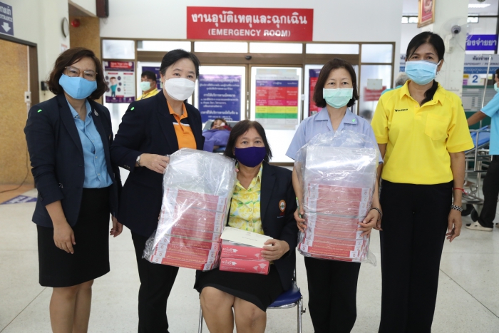 Suvimol Parkpimai博士,护理学院院长 担任曼谷吞武里大学校长 伴随着护理学系 将面罩和一次性手套交给Sampran医院(莱庆),以鼓励和支持医疗和护理人员使用的公共卫生工具,以安全保护自己。并于2020年4月6日在佛统府桑普兰医院(莱兴)发生covid-19病毒爆发,增加了提供公共卫生服务的潜力。