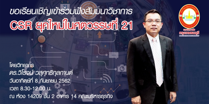 工商管理学院 曼谷吞武里大学 我们邀请您以演讲者Viroj Wasuthasuthikan博士的身份参加21世纪现代企业社会责任研讨会。2019年9月8日,星期日,时间8.30-12.00小时,在工商管理学院14号楼2楼14209室