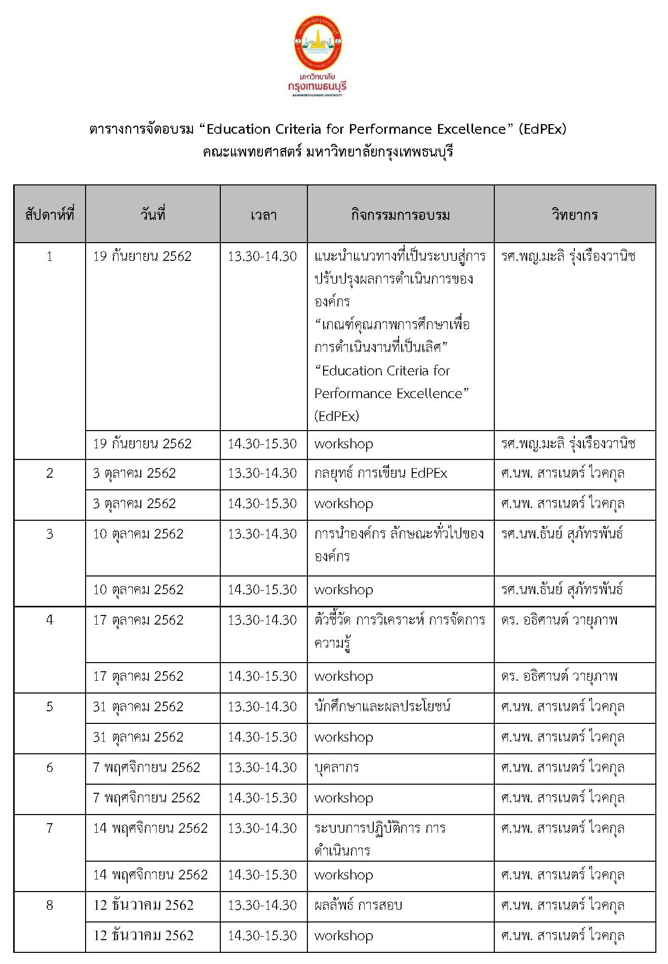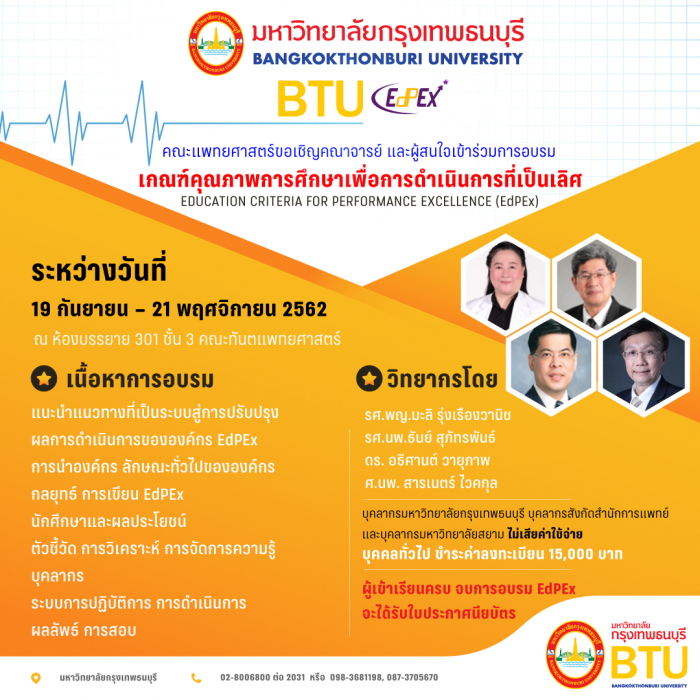 医学系 曼谷吞武里大学 已设置培训 “教育质量标准 操作是优秀“或  教育的标准,卓越绩效线 (EdPEx )在从周期  19日 年9月-  21  年11月  2562   在百家讲坛  301  楼  3  楼,牙医学院。曼谷吞武里大学 为了增进知识 师资理解 和医学院的人员 曼谷吞武里大学的人员和有兴趣的外部人员 有关更多信息,请致电02-8006800分机2031或098-3681198,0873705670。