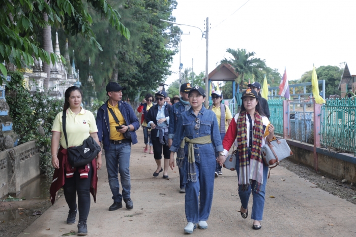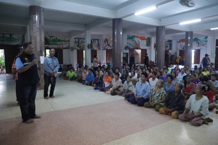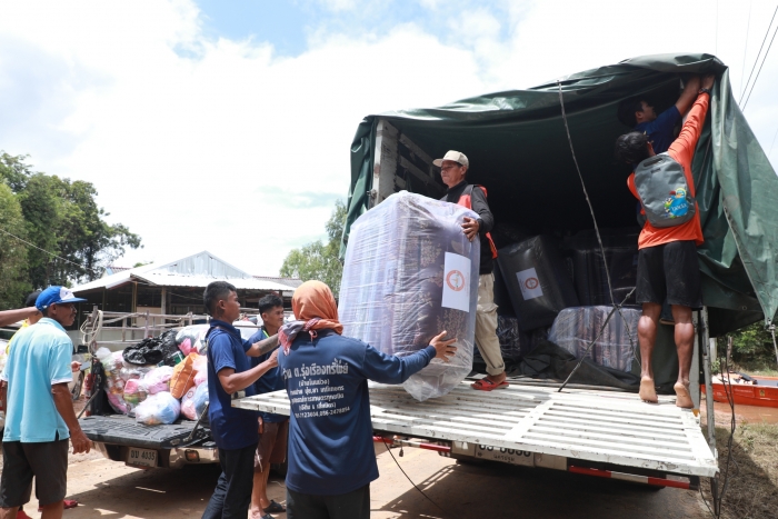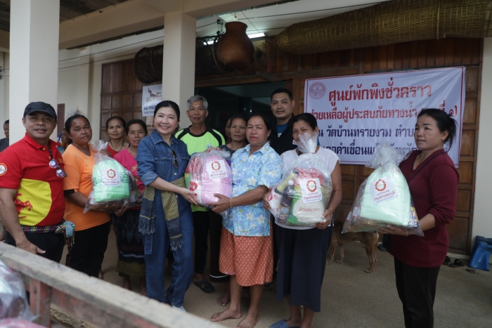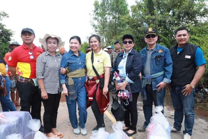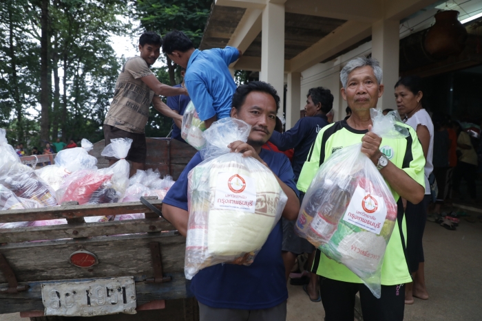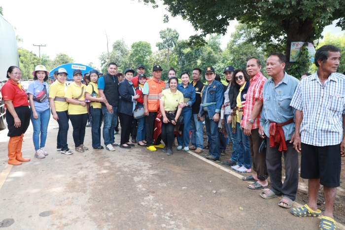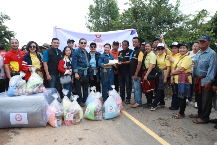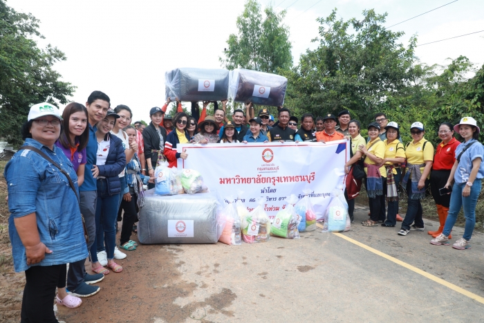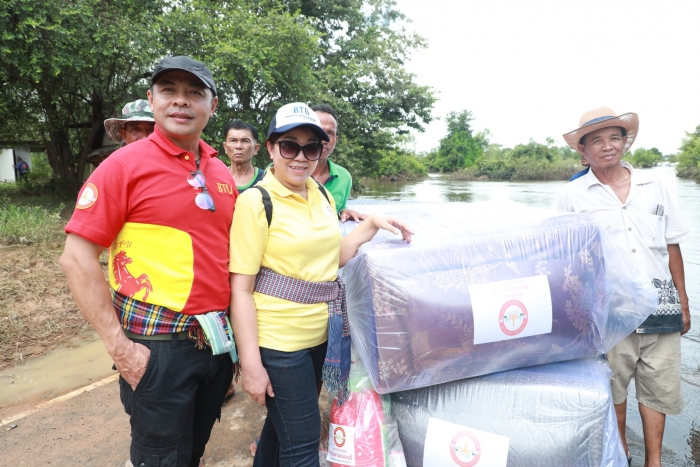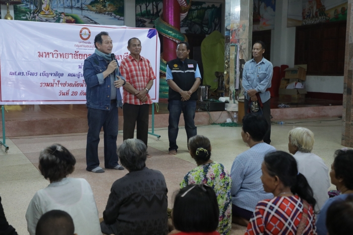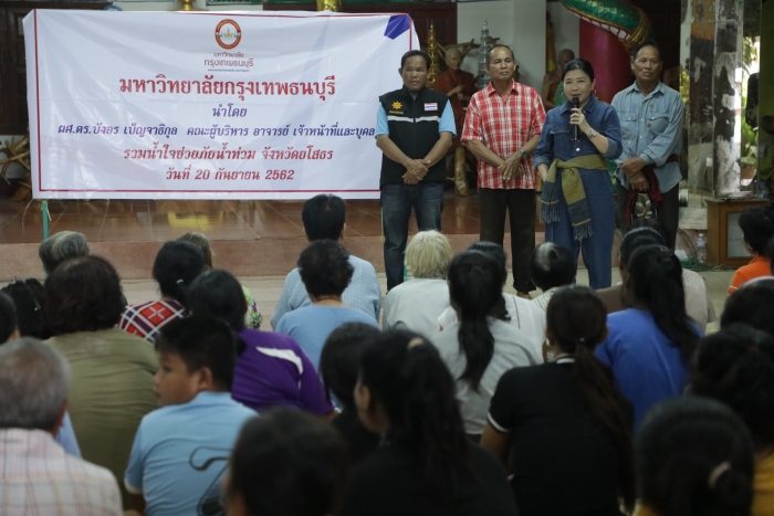 曼谷吞武里大学校长Bangon Ben Chatikun博士助理教授 连同管理人员,教师,教职员工和学生一起加入该地区,以帮助洪水灾民 通过带来消费品 餐具 为了在2019年9月20日帮助Yasothon省Kham Khuean Kaeo区Kudung街道Sai Ngam村地区的人们