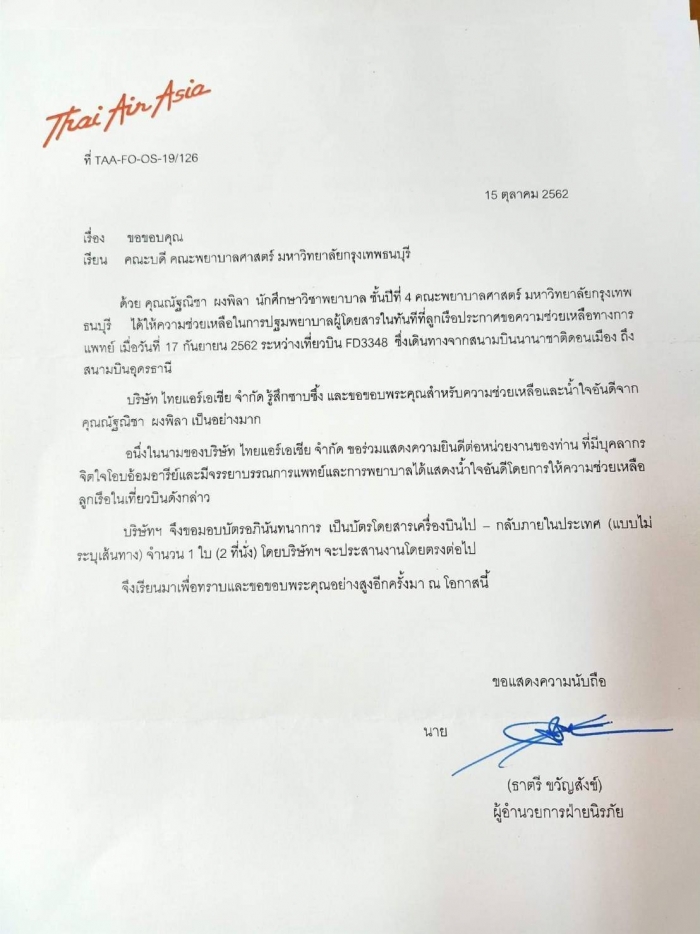 曼谷吞武里大学 对护生的赞美 护理学院 曼谷吞武里大学 这有助于对亚洲航空飞机上的乘客进行急救