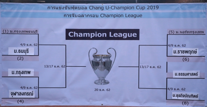 曼谷吞武里大学足球运动员 在2019年10月28日在曼谷大学橄榄球场举行的Chang U-Champion Cup 2019迷你联赛一轮中获得RMUT Thanyaburi 5-0冠军后,将获得A组奖杯和50,000泰铢的奖学金。竞争 曼谷吞武里大学团队可以晋升为团体冠军,并成为参加冠军联赛比赛的八支球队之一。并将在2019年12月4日打开第一个比赛字段