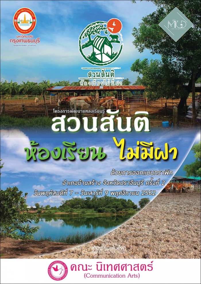 计算机图形专业的学生 媒体设计和媒体制作方面的创新 传播艺术学院 曼谷吞武里大学与Santi Suan合作,教室无遮盖 班桑区 巴真武里 参加良好的活动 根据项目 “发展学习资源,宁静的花园,无遮盖的教室 具有图形设计 班桑区 巴真武里府排名第二”是在2019年11月7日至9日,星期六,目的是为社区提供学术服务。并培训学生使用沟通来促进社会发展。具有在计算机图形学中使用图形设计进行社会发展交流的知识和能力 能够运用知识为周围被自己包围的社会中的人们发展一种生活方式,从而更加有效 能够适应并与社会参与有良好的互动 有主动性和自学能力 并能够负责任地制作创意媒体