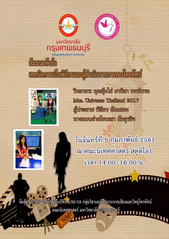 邀请有兴趣参加名为“技术成为MC和 在电视上进行的演讲“ Kookkai-Manisa Phongphon先生的演讲者,2017年泰国环球小姐,播音员,主持人,才华横溢的女商人