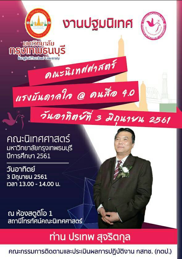 传播艺术学院 曼谷吞武里大学 举办迎新日,安排新的学习和特别讲座 传播艺术学院1室的Parthep Sucharitkul先生的《 @Media People 4.0灵感》曼谷大学吞武里大学