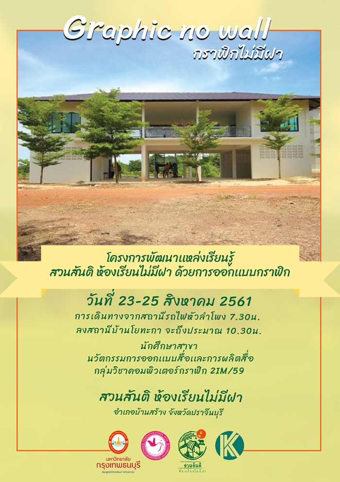 计算机图形专业的学生 媒体设计和媒体制作方面的创新 传播艺术学院 曼谷吞武里大学与Santi Suan合作,教室无遮盖 班桑区 巴真府和古文字专页共同开展精彩活动 根据项目 “发展学习资源,宁静的花园,无遮盖的教室 具有图形设计 班桑区 巴真府”于2018年8月23日至25日(星期六),旨在为社区提供学术服务。并培训学生使用沟通来促进社会发展。具有在计算机图形学中使用图形设计进行社会发展交流的知识和能力 能够运用知识为周围被自己包围的社会中的人们发展一种生活方式,从而更加有效 能够适应并与社会参与有良好的互动 有主动性和自学能力 并能够负责任地制作创意媒体