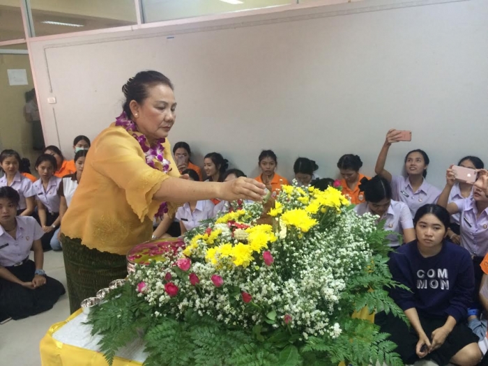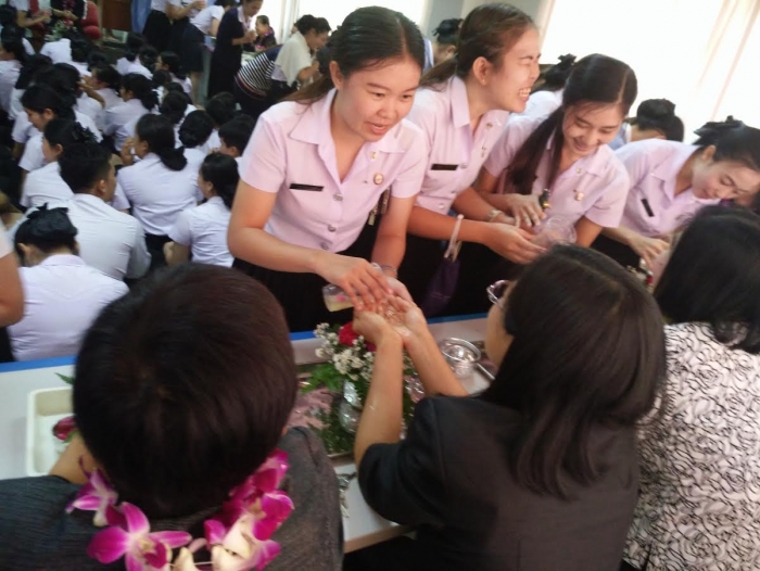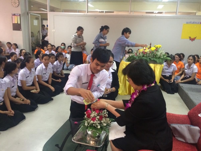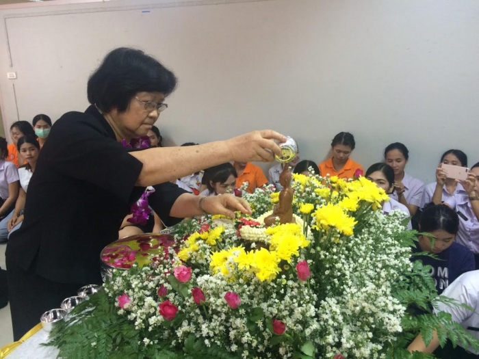护理学院 曼谷大学武里府 由艺术和文化保护小组与学生俱乐部一起 为教师的愿望组织了浇水项目 为了表达敬意,2016年学年于2017年4月21日举行。感谢老师的宽恕,这对护生是一种祝福。作为泰国文化的传统,该项目的氛围,参加此次活动的教职员工,护理学生和校友都充满了热情。冷静快乐 在院长和教职员工的问候下,该活动是一年级和二年级护理专业学生的共同努力,从而在“浇水愿望项目”中对教师的满意度进行了评估。2016学年的水平很高,建议每年这样组织