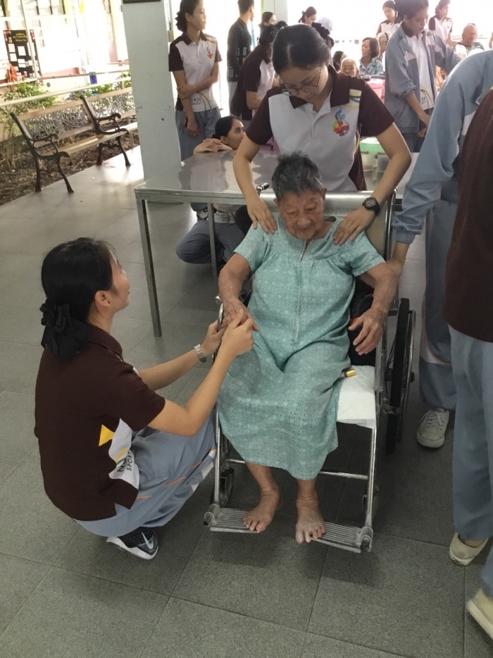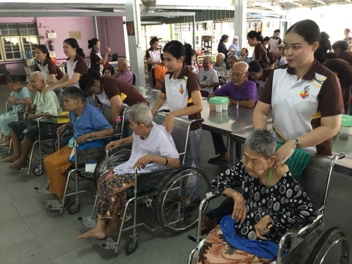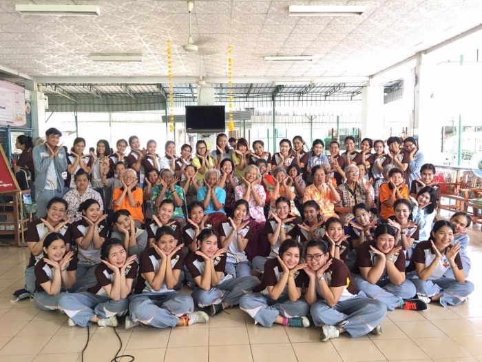 护理学院 曼谷大学武里府 通过维护文化艺术 与3年级护生合作,组织了“泰国智慧计划”,以照顾老年人的健康 用冰片水放松按摩 (一年级护理学生的泰国智慧产品)与老年人护理课程的教学和学习相结合,在佛统长者之家组织了活动。和Chalerm Rajakumari老人之家 (黄河爪)