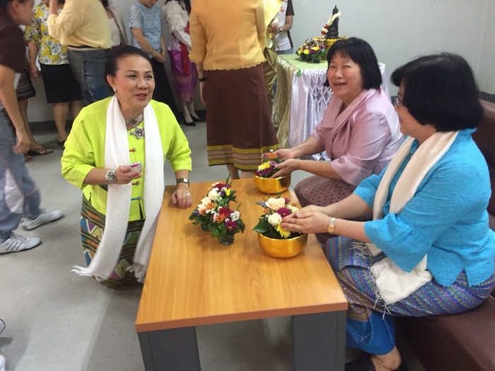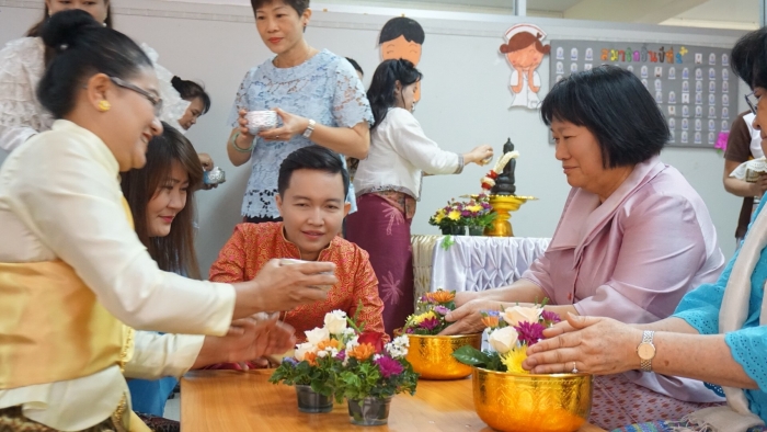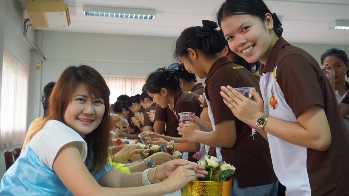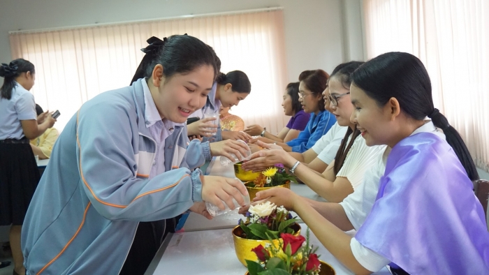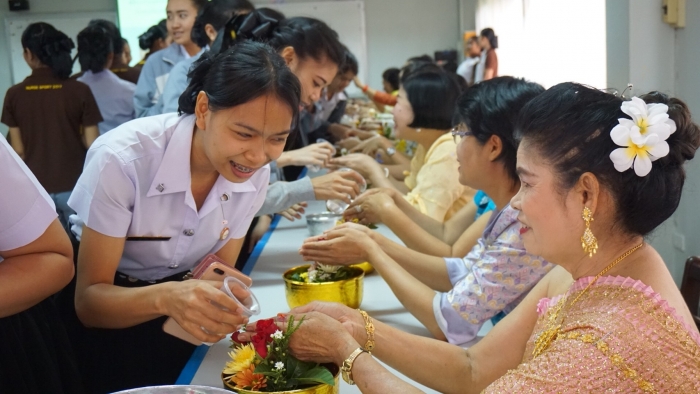 护理学院的学生俱乐部与艺术和文化保护小组的学院一起组织了浇水仪式,以祝福泼水节的老师们。通过参加课外活动 为了表示尊重 感谢 并要求教职员工对犯下过错或冒犯性行为的行为进行宽恕,无论是否身体虐待 口头上或精神上 并要求教师的祝福,以在泰国新年之初为护生们带来好运 这次,全体教职员工一起穿着泰国服装,以继承泰国的传统和文化。